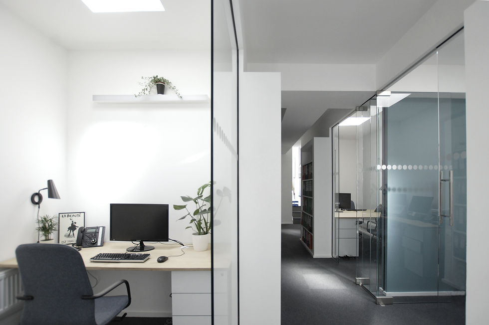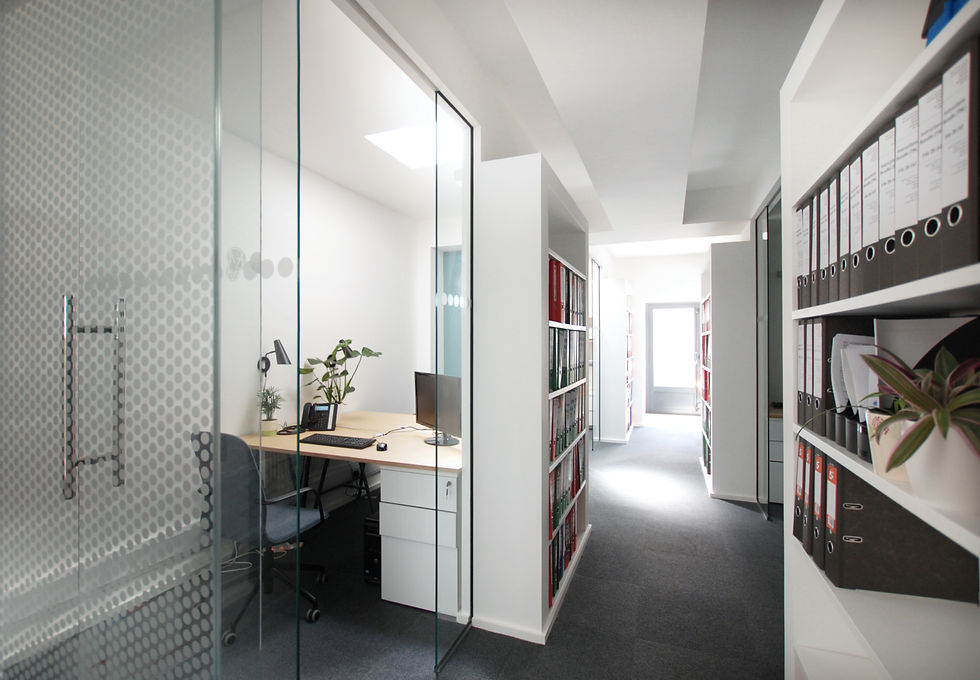 Glazed pods for 7 solicitors are designed to fit into a narrow rear extension utilising sky lights to enhance the spatial quality of what was previously a dark and oppressive space. All the main storage and archiving is efficiently located along a central corridor, maximising the space within each pod and providing visual interest along the circulation zone. Bespoke furniture and fittings designed by Poroban.